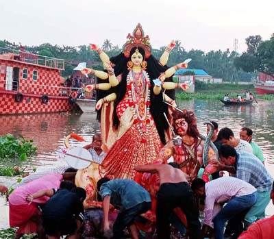 চাঁদপুর শহরে আনন্দঘন পরিবেশে দুর্গা বিসর্জন সম্পন্ন হয়েছে। গত শুক্রবার বিকেলে চৌধুরী ঘাট ডাকাতিয়া নদীতে দুর্গা প্রতিমা বিসর্জন দেয়া হয়। সন্ধ্যার মধ্যে বিসর্জন সম্পন্ন করা হয়। ঢাকের তালে শিশু-কিশোররা নেচে আনন্দ-উদ্দীপনা করে ট্রাক, রিক্সা-ভ্যানে করে দুর্গা প্রতিমূর্তি শহর প্রদক্ষিণ করে চৌধুরী ঘাট ডাকাতিয়া নদী পারে নিয়ে পুরোহিতের মন্ত্রপাঠের মাধ্যমে নদীতে বিসর্জন করা হয়। এর আগে দুপুরের পর থেকে বিবাহিত নারীরা দুর্গা প্রতিমার কপালে তেল, সিঁদুর পরাতে ব্যস্ত সময় পার করে। মায়ের মুখ রাঙ্গিয়ে তোলে। পাশাপাশি নারীরা নিজেরাই সিঁদুর খেলায় মেতে উঠে।
