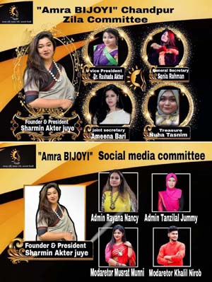 আমরা ‘বিজয়ী’ চাঁদপুর জেলা কমিটির সদস্যরা হলেন- ফাউন্ডার ও প্রেসিডেন্ট শারমিন আক্তার জুঁই, ভাইস প্রেসিডেন্ট ডা. রাশেদা আক্তার, জেনারেল সেক্রেটারি সোনিয়া রহমান, জয়েন্ট সেক্রেটারি আমেনা বারী মৌসুমী ও ট্রেজারার নুহা তাসনিম।