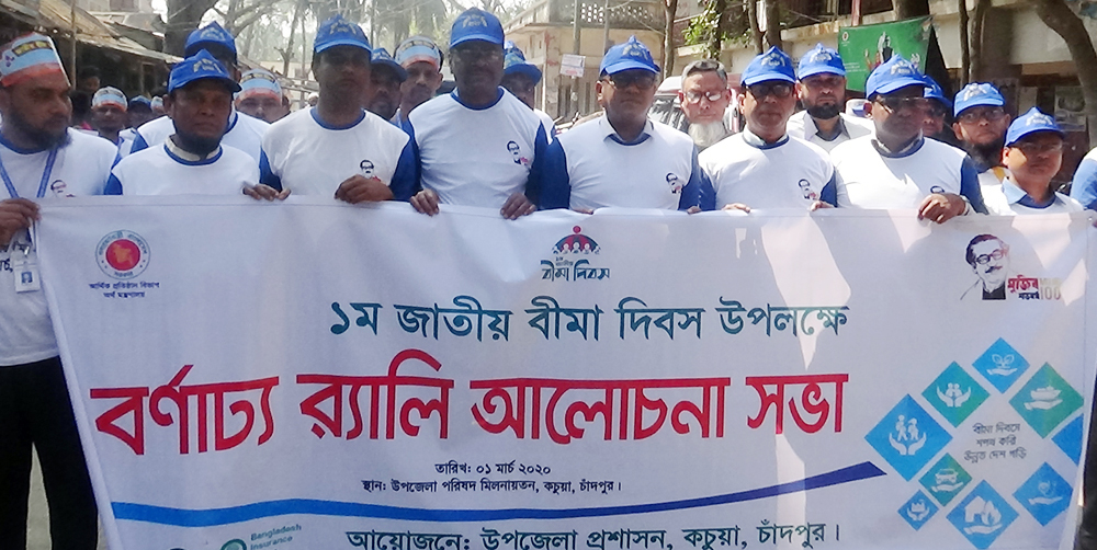 ‘বীমা দিবসে শপথ করি উন্নত দেশ গড়ি’ এ স্লোগানে বর্ণাঢ্য র্যালি ও আলোচনা সভার মধ্য দিয়ে কচুয়ায় জাতীয় বীমা দিবস পালিত হয়েছে। গতকাল রোববার কচুয়া উপজেলা প্রশাসনের আয়োজনে কচুয়া উপজেলায় কর্মরত সব বীমা কোম্পানীর কর্মকর্তা ও প্রতিনিধিদের অংশগ্রহণে ইউএনও’র নেতৃত্বে বর্ণাঢ্য র্যালি পৌর বাজারের গুরুত্বপূর্ণ সড়ক প্রদক্ষিণ শেষে উপজেলা পরিষদ মিলনায়তনে আলোচনা সভায় মিলিত হয়।