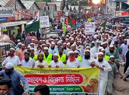 দেশব্যাপী অব্যাহত খুন, ধর্ষণ, নারী নির্যাতন, ব্যাভিচার ও দ্রব্যমূল্যের লাগামহীন ঊর্ধ্বগতির প্রতিবাদে চাঁদপুরে ইসলামী আন্দোলনের বিক্ষোভ মিছিল অনুষ্ঠিত হয়েছে। বুধবার (২১ অক্টোবর) বিকেলে শহরের শপথ চত্বর এলাকায় বিক্ষোভ মিছিল পূর্ব সমাবেশ অনুষ্ঠিত হয়। সমাবেশে প্রধান অতিথি হিসেবে বক্তব্য রাখেন ইসলামী আন্দোলনের কেন্দ্রিয় মহাসচিব অধ্যক্ষ হাফেজ মাওলানা ইউনুস আহমদ।