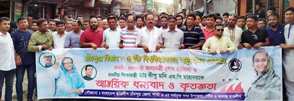 চাঁদপুরে বিজ্ঞান ও প্রযুক্তি বিশ্ববিদ্যালয়ের অনুমোদন দেয়ায় প্রধানমন্ত্রী শেখ হাসিনা ও শিক্ষামন্ত্রী ডা. দীপু মনি এমপিকে আন্তরিক ধন্যবাদ ও কৃতজ্ঞতা জানিয়ে আনন্দ মিছিল অনুষ্ঠিত হয়েছে। গতকাল মঙ্গলবার বিকেলে জেলা যুবলীগ ও ছাত্রলীগের উদ্যোগে চাঁদপুর শহরে আনন্দ মিছিল বের হয়। মিছিলটি শহর প্রদক্ষিণ করে জেলা আওয়ামী লীগ কার্যালয়ে গিয়ে শেষ হয়।