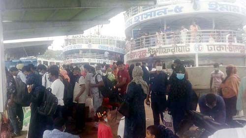 সকালে লঞ্চঘাটে গিয়ে দেখা যায়, যাত্রীদের উপচেপড়া ভিড়। কোনো ধরনের সামাজিক দূরত্বই মানা হচ্ছে না। একজনের শরীর ঘেঁষে অপরজন দাঁড়িয়ে অপেক্ষা করছে লঞ্চের জন্য। আর ঘাট থেকে ছেড়ে যাওয়া লঞ্চের চিত্রও একই। লঞ্চের ভেতরে-বাইরে যাত্রী আর যাত্রী। অনেকের মুখে মাস্ক থাকলেও অনেকে যাত্রীকে তা পড়তে দেখা যায়নি।