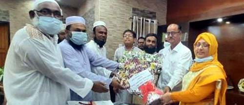 চাঁদপুর আহমাদিয়া ফাজিল মাদ্রাসার নবগঠিত গভর্নিং বডির প্রথম সভায় ইসলামী আরবি বিশ্ববিদ্যালয় কর্তৃক পুনঃনির্বাচিত সভাপতি জেলা প্রশাসক অঞ্জনা খান মজলিশকে ফুল দিয়ে বরণ করেন মাদ্রাসা গভর্নিং বডির পুনঃনির্বাচিত সহ-সভাপতি মোহাম্মদ আলী জিন্নাহ ও সদস্য সচিবসহ সদস্যরা।