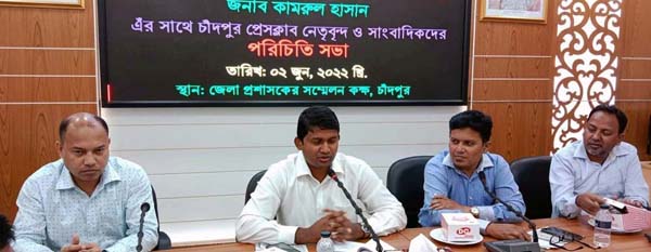 চাঁদপুরের নবাগত জেলা প্রশাসক কামরুল হাসানের সাথে চাঁদপুর প্রেসক্লাব নেতৃবৃন্দ ও সাংবাদিকদের পরিচিতি সভা অনুষ্ঠিত হয়েছে। গত বৃহস্পতিবার দুপুরে জেলা প্রশাসকের সম্মেলন কক্ষে এ সভা অনুষ্ঠিত হয়। সভায় টেলিভিশন সাংবাদিক ফোরাম ও ফটো জার্নালিস্ট অ্যাসোসিয়েশন নেতৃবৃন্দ উপস্থিত ছিলেন।