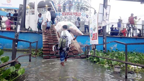 পূর্ণিমার প্রভাব কেটে গেলেও দক্ষিণা বাতাসে পদ্মা-মেঘনার পানি ফুলে-ফেঁপে উঠেছে। এ কারণে চাঁদপুরে মেঘনার পানি বিপদসীমার ৭৯ সেন্টিমিটার উপর দিয়ে প্রবাহিত হচ্ছে। ঝুঁকিপূর্ণ হয়ে পড়েছে শহর রক্ষা বাঁধ। বুধবার (৫ আগস্ট) বিকেলে জোয়ারের পানি বেড়ে যাওয়ায় শহরের প্রায় প্রত্যেকটি সড়কে পানিতে।