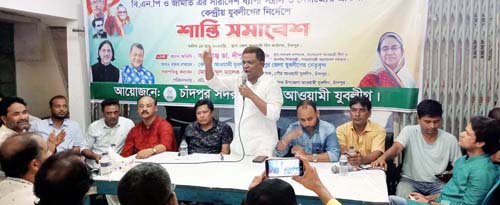 বিএনপি-জামায়াতের দেশব্যাপী সন্ত্রাস ও নৈরাজ্যের প্রতিবাদে কেন্দ্রিয় যুবলীগের নির্দেশনা অনুযায়ী শান্তি সমাবেশ করেছে চাঁদপুর সদর ও পৌর যুবলীগ। বুধবার (১৪ জুন) বিকেলে চাঁদপুর জেলা আওয়ামী লীগ কার্যালয়ে শান্তি সমাবেশে প্রধান অতিথির বক্তব্য রাখেন জেলা যুবলীগের যুগ্ম-আহ্বায়ক মাহফুজুর রহমান টুটুল।