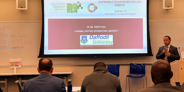 যুুক্তরাষ্ট্রের নিউইয়র্কে জাতিসংঘের সদর দপ্তরে অনুষ্ঠিত টেকসই শিক্ষা সভায় মূল প্রবন্ধ উপস্থাপন করেছেন ড্যাফোডিল ইন্টারন্যাশনাল ইউনিভার্সিটির প্রতিষ্ঠাতা ও ট্রাস্টি বোর্ডের চেয়ারম্যান ড. মো. সবুর খান। গত ২৫ থেকে ২৭ সেপ্টেম্বর জাতিসংঘের সাধারণ পরিষদের উদ্বোধনী সপ্তাহে এই ‘টেকসই শিক্ষাসভা’ অনুষ্ঠিত হয় এবং এতে ড. মো. সবুর খান ‘বাংলাদেশে শিক্ষার উন্নয়ন এবং আন্তর্জাতিক আর্থিক সংস্থাগুলোর ভূমিকা: প্রেক্ষাপট এশিয়া’ শীর্ষক মূল প্রবন্ধ উপস্থাপন করেন। সভায় কেপ ভার্দের প্রধানমন্ত্রী জোসে ইউলিসিস দা পিনা কোরেইয়াসহ বিভিন্ন দেশের সাত জনেরও বেশি শিক্ষামন্ত্রী অংশগ্রহণ করেন।