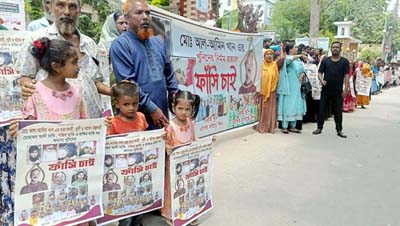 চাঁদপুর শহরের পুরাণবাজারে সংঘর্ষের ঘটনায় আল-আমিন হত্যাকান্ডের বিচারের দাবিতে মানববন্ধন এবং বিক্ষোভ করেছে পরিবার ও এলাকাবাসী। মঙ্গলবার (২৫ জুন) দুপুরে চাঁদপুর প্রেসক্লাবের সামনে ঘণ্টাব্যাপী মানববন্ধন কর্মসূচি পালন ও শহরের বিভিন্ন সড়ক বিক্ষোভ মিছিল করেন তারা।