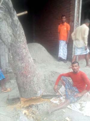 জানা যায়, চাপিলা গ্রামের হাজি মো. সুলতান তালুকদারের ফরাক্কাবাদ বাজারে বহুতল ভবনের নির্মাণ কাজ চলছে। সে মার্কেট নির্মাণের সুবিধার জন্য সরকারি গাছগুলো কেটে মার্কেটের সামনে অংশ ফাকা করা হয়। সরকারি অনুমতি নিয়ে গাছ কাটা হচ্ছে বলে সুলতান তালুকদার স্থানীয়দের জানান। ইউএনও অফিস থেকে অনুমতি নিয়েই কাটছেন বলে তিনি তখন স্থানীয়দের জানান। কয়েক ঘণ্টার মধ্যে মার্কেটের সামনে থাকা তাল ও কড়ই গাছ কেটে মুহূর্তের মধ্যে সরিয়ে নেন। কোন মানুষ যাতে এসে গাছের অস্তিত্বের সন্ধানও না পায়। সেজন্য কেটে ফেলা গাছের গোড়ায় কয়েক ট্রাক বালু ফেলে রাখেন।