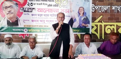 বাংলাদেশ আওয়ামী লীগের ৭০তম প্রতিষ্ঠাবার্ষিকী উপলক্ষে গতকাল শনিবার ফরিদগঞ্জ উপজেলা আওয়ামী লীগ কেক কাটা শেষে আলোচনা সভা করেছে। সকালে দলের কার্যালয়ে আলোচনা সভায় সংগঠনের সভাপতি মুক্তিযোদ্ধা আবুল খায়ের পাটওয়ারীর সভাপতিত্বে এবং প্রচার সম্পাদক সুলতান আহমেদ রিপনের পরিচালনায় বক্তব্য রাখেন সাধারণ সম্পাদক আবু সাহেদ সরকার, সহ-সভাপতি আবুল হোসেন বাবুল পাটওয়ারী, যুগ্ম সম্পাদক আলমগীর হোসেন ও ওয়াহিদুর রহমান রানা, সাংগঠনিক সম্পাদক ওমর ফারুক ফারুকী, সাংস্কৃতিক সম্পাদক মশিউর রহমান মিঠু, ইউপি চেয়ারম্যান শওকত আলী, উপজেলা যুব লীগের যুগ্ম-আহ্বায়ক শফিকুর রহমান, ছাত্রলীগের সভাপতি মাহবুব আলম সোহাগ, স্বেচ্ছাসেবক লীগের সম্পাদক কাউছারুল আলম কামরুল, উপজেলা মুক্তিযোদ্ধা সংসদের কমান্ডার শহিদ উল্ল্যা তপদার। আলোচনা শেষে প্রতিষ্ঠাবার্ষিকীর কেক কাটা হয়।