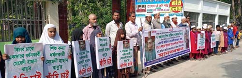 ঘণ্টাব্যাপী মানববন্ধনে শিক্ষা প্রতিষ্ঠানের শিক্ষার্থীসহ বিভিন্ন শ্রেণি-পেশার মানুষ অংশগ্রহণ করে। এ সময় মানববন্ধনে অংশগ্রহণকারীরা ধর্ষক মেহেদী হাসান বাবুকে আইনের আওতায় এনে ধর্ষণের সর্Ÿোচ্চ শাস্তি মৃত্যুদণ্ডের দাবি জানান।
