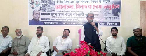 ২৫ মার্চ গণহত্যা দিবস উপলক্ষে ফরিদগঞ্জ পৌরসভার উদ্যোগে আলোচনা সভা ও দোয়া অনুষ্ঠিত হয়েছে। শনিবার (২৫ মার্চ) সকালে পৌরসভার হলরুমে নির্বাহী প্রকৌশলী নজরুল ইসলাম চৌধুরীর সভাপতিত্বে প্রধান অতিথির বক্তব্য রাখেন উপজেলা আওয়ামী লীগের সভাপতি ও পৌর মেয়র মুক্তিযোদ্ধা আবুল খায়ের পাটওয়ারী।