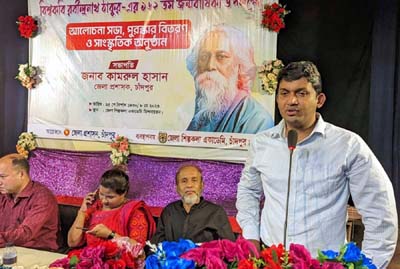‘সমাজ সংস্কার ও রবীন্দ্রনাথ’ এ প্রতিপাদ্য বিষয় নিয়ে চাঁদপুরে বিশ্বকবি রবীন্দ্রনাথ ঠাকুরের ১৬২তম জন্মবার্ষিকী উপলক্ষে আলোচনা সভা, পুরস্কার বিতরণ ও সাংস্কৃতিক অনুষ্ঠান অনুষ্ঠিত হয়েছে। সোমবার (৯ মে) রাতে জেলা শিল্পকলা একাডেমি মিলনায়তনে অনুষ্ঠানে সভাপতিত্ব করেন জেলা প্রশাসক কামরুল হাসান।
