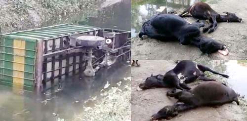 স্থানীয়রা জানায়, চলতি অবস্থায় হঠাৎ করে গরুবাহী টমটমটি ক্যানেলে পড়ে যায়। টমটমের তলে পড়ে গেলে ৪ টি গরু পানিতে ডুবে মারা যায়। ৫টি গরু বাঁচানো গেছে।