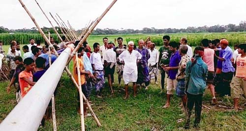 গতকাল মঙ্গলবার সকালে সানকিভাঙ্গা গ্রামের কৃষক-কৃষাণীরা জমিতে নেমে প্রতিবাদ জানান।