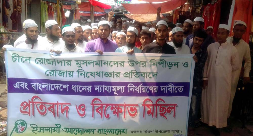 ইসলামী আন্দোলন মতলব দক্ষিণ শাখার উদ্যোগে গতকাল শনিবার বাদ আছর মতলব বাজার শাহী জামে মসজিদ প্রাঙ্গণ থেকে প্রতিবাদ ও বিক্ষোভ মিছিল বের হয়। চীনে রোজাদার মুসলমানদের উপর নিপীড়ন ও রোজায় নিষেধাজ্ঞার প্রতিবাদ এবং বাংলাদেশের ধানের ন্যায্যমূল্যে নির্ধারণের দাবিতে এ প্রতিবাদ ও বিক্ষোভ মিছিল অনুষ্ঠিত হয়। মিছিল বাজারের গুরুত্বপূণ সড়ক প্রদক্ষিণ করে পুনরায় শাহী-জামে মসজিদ প্রাঙ্গণে এসে শেষ হয়।