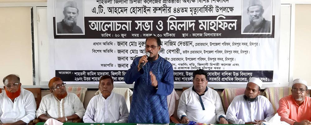 চাঁদপুর সদর উপজেলার শাহমাহমুদপুর ইউনিয়নের শাহতলী কামিল মাদ্রাসা, জিলানী চিশতী কলেজ, জিলানী চিশতী উচ্চ বিদ্যালয়, উত্তর শাহতলী যোবাইদা বালক সরকারি প্রাথমিক বিদ্যালয় ও মধ্য শাহতলী কাদেরিয়া সরকারি প্রাথমিক বিদ্যালয়ের যৌথ আয়োজনে বিশিষ্ট শিক্ষাবিদ ও জিলানী চিশতী কলেজসহ বিভিন্ন শিক্ষা প্রতিষ্ঠানের প্রতিষ্ঠাতা মরহুম মাওলানা এটি আহমেদ হোসাইন রুশদীর ৪৪তম মৃত্যুবার্ষিকী উপলক্ষে আলোচনা সভা ও দোয়া অনুষ্ঠিত হয়েছে।
