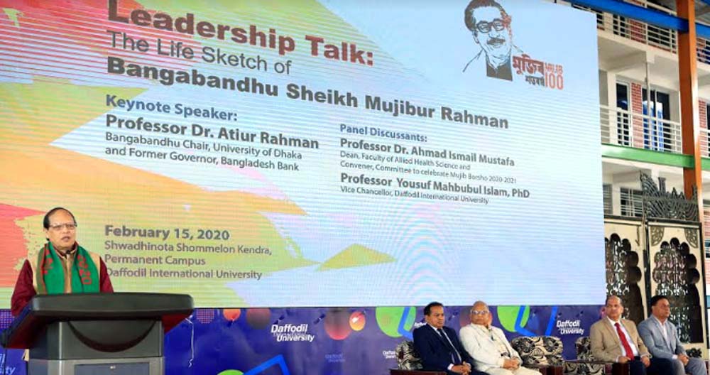 মুজিব শতবর্ষ উদযাপনের অংশ হিসেবে ড্যাফোডিল ইন্টারন্যাশনাল ইউনিভার্সিটির স্থায়ী ক্যাম্পাস আশুলিয়ার স্বাধীনতা সম্মেলন কেন্দ্রে গত ১৫ ফেব্রুয়ারি জাতির জনক বঙ্গবন্ধু শেখ মুজিবুর রহমানকে নিয়ে ‘লিডারশিপ টক’ শীর্ষক এক আলোচনা অনুষ্ঠিত হয়েছে। অনুষ্ঠানে মুখ্য আলোচক হিসেবে উপস্থিত ছিলেন বাংলাদেশ ব্যাংকের সাবেক গভর্নর ড. আতিউর রহমান। এছাড়া ভিডিও বার্তার মাধ্যমে অনুষ্ঠানে অংশ নেন মুজিব শতবর্ষ উদযাপন কমিটির প্রধান সমন্বয়ক ড. কামাল আব্দুল নাসের চৌধুরী।