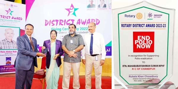 রোটারী পোলিও অ্যাওয়ার্ড ছাড়াও রোটা. মাহবুবুর রহমান সুমন ডিস্ট্রিক্ট বেস্ট রোটারিয়ান ও ডিস্ট্রিক্ট ইভেন্টে সর্বোচ্চ উপস্থিতি ক্যাটাগরিতে পুরস্কার অর্জন করেন।