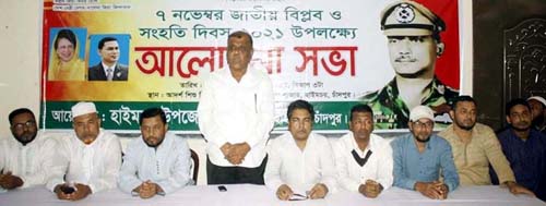হাইমচর উপজেলা বিএনপির আয়োজনে ৭ নভেম্বর জাতীয় বিপ্লব ও সংহতি দিবস উপলক্ষে আলোচনা সভা অনুষ্ঠিত হয়েছে। রোববার (৭ নভেম্বর) বিকেল ৪টায় হাইমচর উপজেলার সদর আলগী বাজার আদর্শ শিশু নিকেতন জুনিয়র হাইস্কুলে অনুষ্ঠিত আলোচনা সভায় হাইমচর উপজেলা বিএনপির সভাপতি মো. আমিন উল্লাহ বেপারীর সভাপতিত্বে এবং যুগ্ম সাধারণ সম্পাদক প্রভাষক হারুন অর রশিদের পরিচালনায় বক্তব্য রাখেন হাইমচর উপজেলা বিএনপি সাধারণ সম্পাদক মো. মাজহারুল ইসলাম সফিক পাটওয়ারী।
