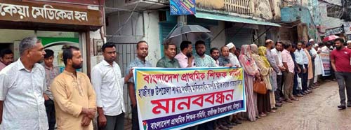 মানববন্ধনে শিক্ষক সমিতির সদস্য ও প্রধান শিক্ষক মঞ্জিল হোসেন, কামরুন নাহার, হেদায়েত উল্যাহ্, তুহিন হায়দার, আবুল খায়ের খাঁন, খিজির আহমেদ, আব্দুল হক ও জুলফিকার আলী, সহকারী শিক্ষক এমরান হোসেন সুমন, মঞ্জুর আলম, ফারজানা আক্তার, সাইফুল ইসলাম, শহীদুল্লাহ, মঞ্জুর মাওলাসহ শিক্ষক সমিতির নেতৃবৃন্দ ও বিভিন্ন প্রাথমিক বিদ্যালয়ের প্রধান ও সহকারী শিক্ষকরা উপস্থিত ছিলেন।