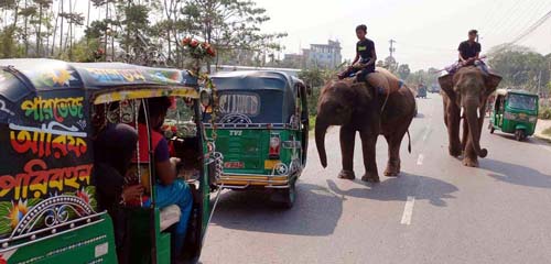 সরেজমিন দেখা যায়, বড় দুইটি হাতি আঞ্চলিক মহাসড়ক দিয়ে হেঁটে হেঁটে চাঁদা আদায় করছে। হাতি দুটোর পিঠে বসে আছেন ২০ থেকে ২২ বছর বয়সী দুই তরুণ। পাকা সড়কের রাস্তার বিভিন্ন যানবাহনের সামনে দাঁড়িয়ে যানবাহনের গতিরোধ করে যাত্রী ও পথচারীদের কাছ থেকে হাতির শুঁড় উঁচু করে যাত্রী ও চালকের কাছ থেকে জোরপূর্বক চাঁদা আদায় করছেন।