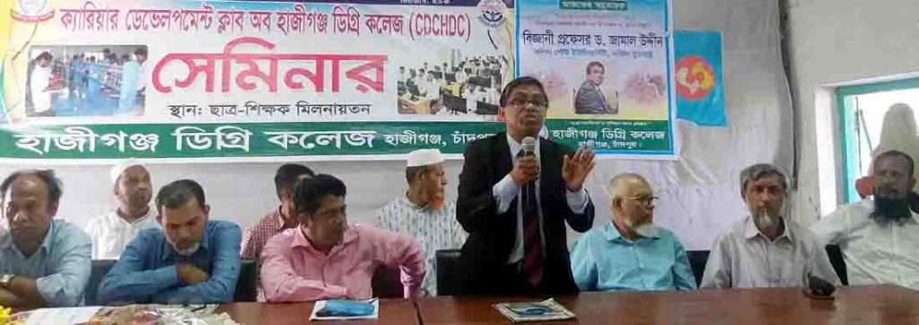 হাজীগঞ্জ ডিগ্রি কলেজে শিক্ষার্থীদের ক্যারিয়ার ডেভেলপমেন্ট ক্লাব বিষয়ক সেমিনার অনুষ্ঠিত হয়েছে। গতকাল শনিবার দুপুরে কলেজের ছাত্র-শিক্ষক মিলনাতয়নে অনুষ্ঠিত সেমিনারে প্রধান অতিথি হিসেবে উপস্থিত ছিলেন বাংলাদেশের বিজ্ঞানী এবং যুক্তরাষ্ট্রের ম্যারিল্যান্ডে অবস্থিত কপিন স্টেট ইউনিভার্সিটির ন্যাচারাল সায়েন্স বিভাগের অধ্যাপক ও গবেষক হাজীগঞ্জের কৃতী সন্তান ড. জামাল উদ্দিন।