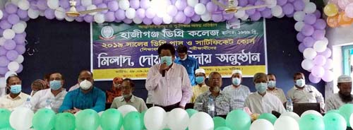 হাজীগঞ্জ ডিগ্রি কলেজের ২০১৯ সালের ডিগ্রি পাস ও সার্টিফিকেট কোর্স পরীক্ষার্থীদের (শিক্ষাবর্ষ ২০১৬-১৭) বিদায় উপলক্ষে মিলাদ, দোয়া ও আলোচনা সভা অনুষ্ঠিত হয়েছে। কলেজ অধ্যক্ষ
